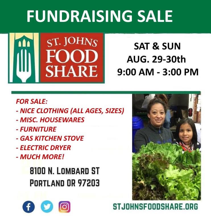 The St. Johns Food Share is having a fundraising sidewalk sale this weekend, Sept. 5th and 6th from 9 p.m. – 3 p.m.